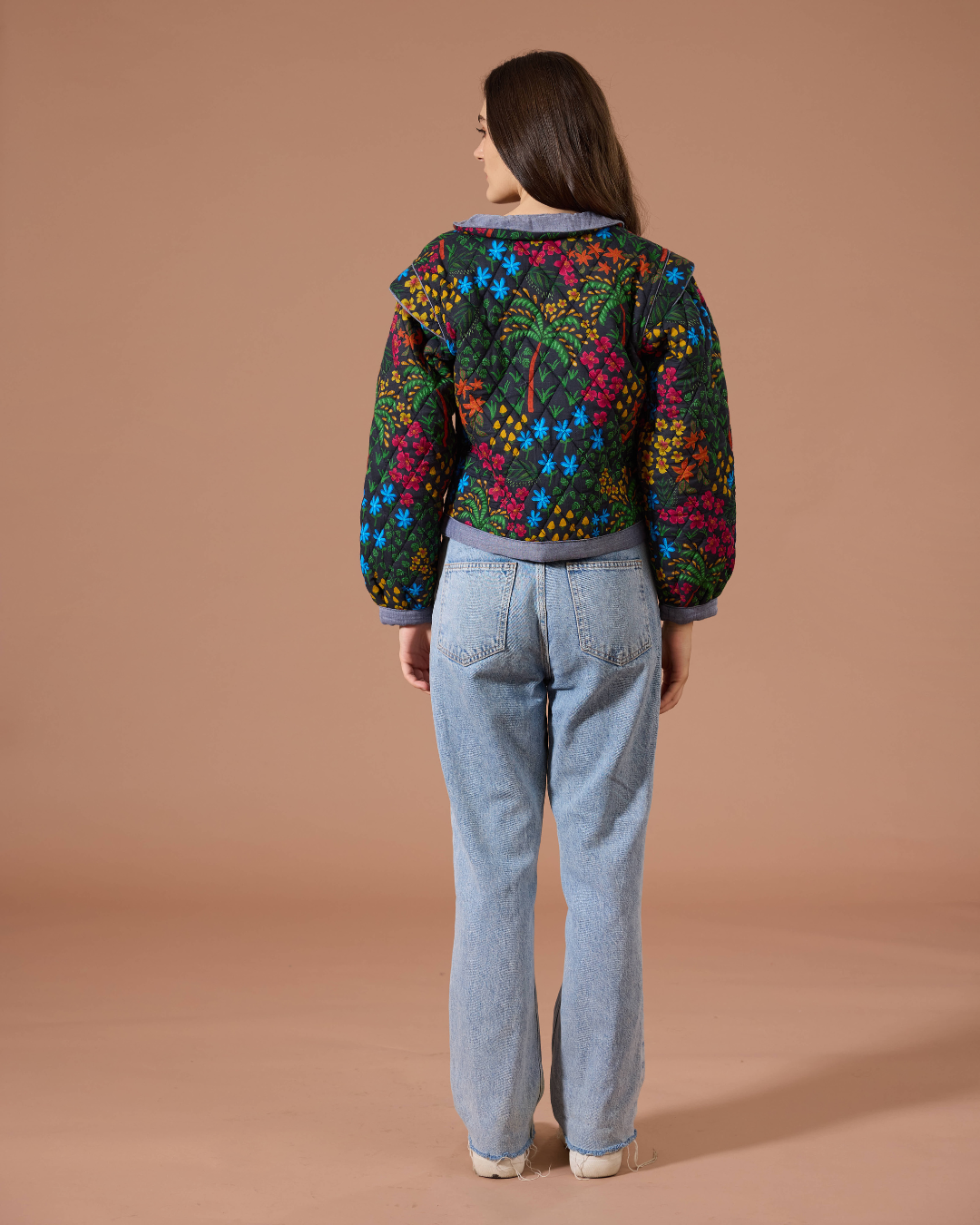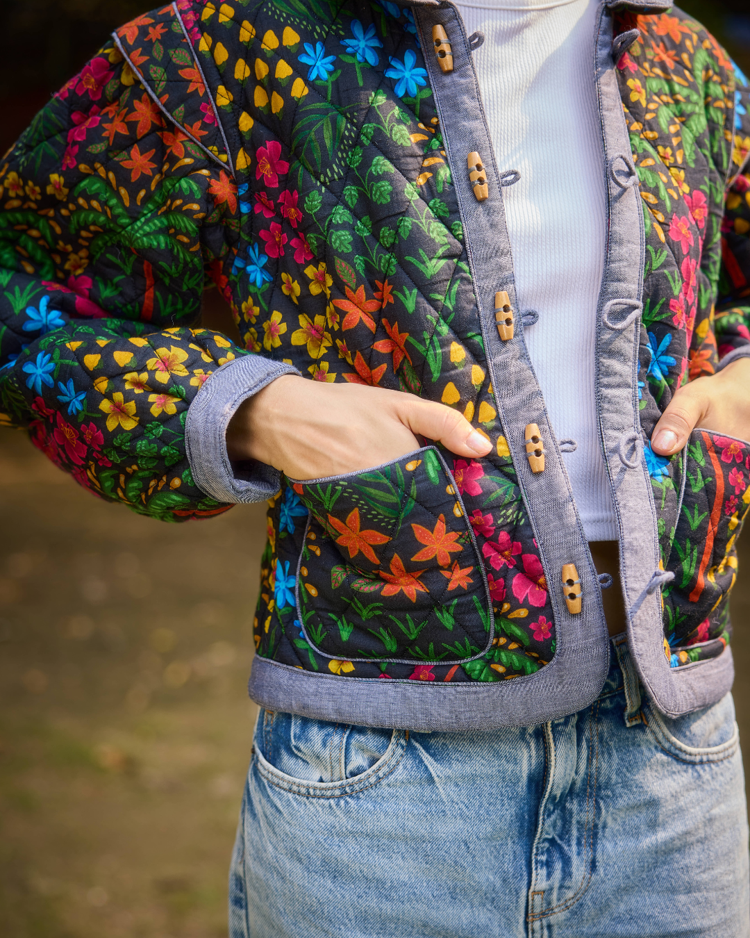 Unleash your wild side with the Jaipur Quilted Jacket—a playful escape wrapped around your shoulders. Adorned with jungle-inspired prints that burst with exotic flora and fauna, this collared quilted piece transforms any outfit into an adventure. The lightweight quilting provides just the right amount of warmth without the bulk, making it ideal for layering through seasons. Whether you're channeling safari chic or simply craving a dose of nature-inspired flair, this jacket brings untamed personality and comfort to your everyday wardrobe.